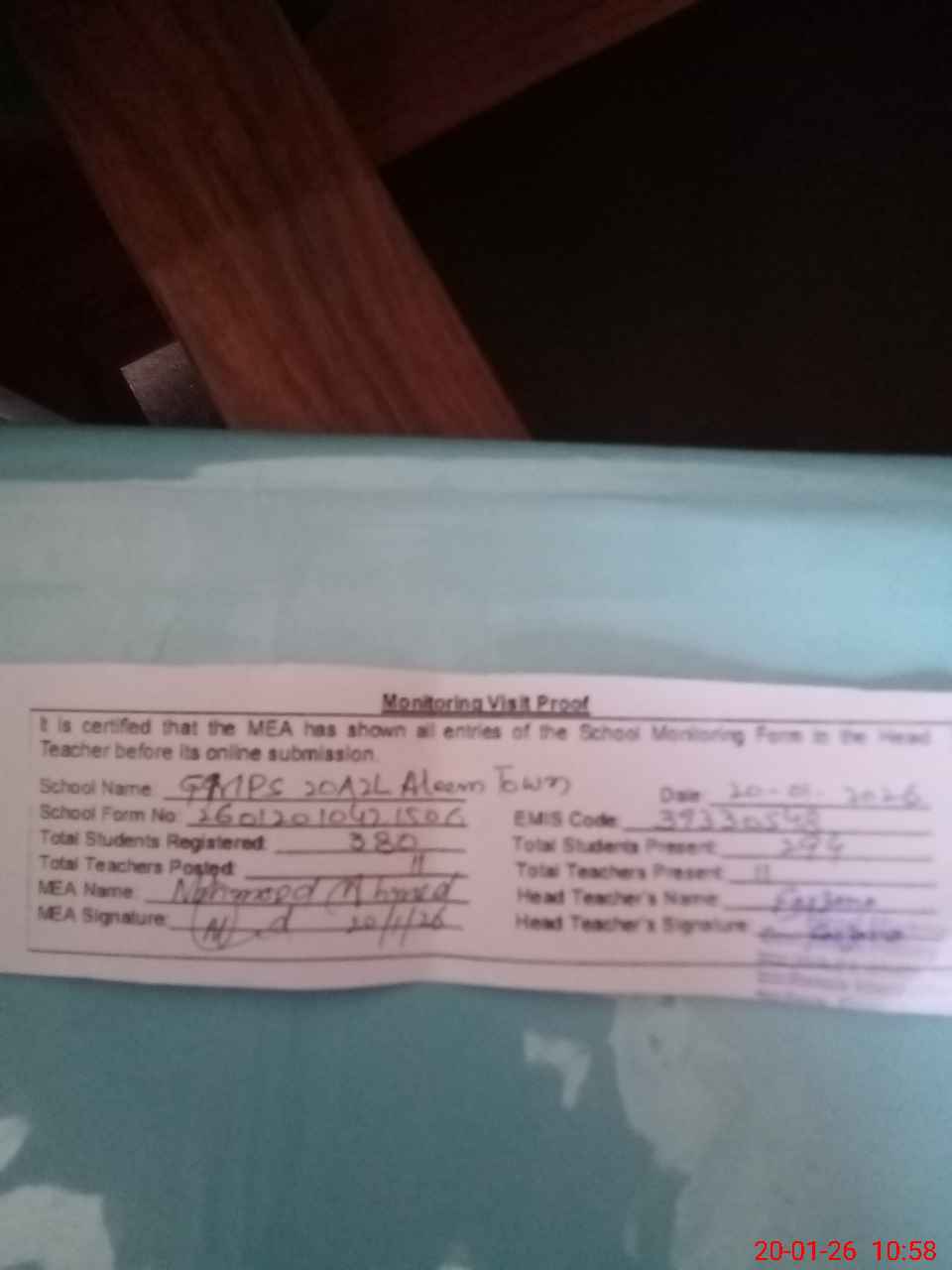 | Attendance Register | Head Teacher | MEA with School | Visit Proof |