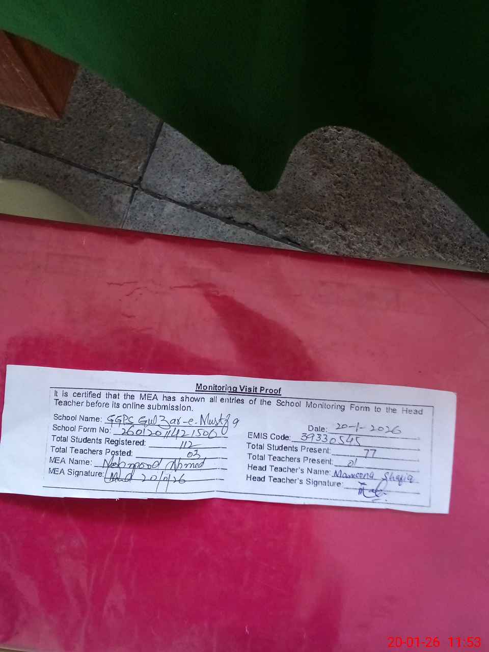 | Attendance Register | Head Teacher | MEA with School | Visit Proof |