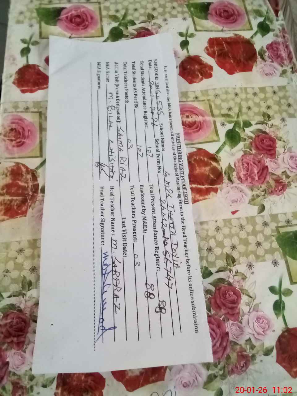 | Attendance Register | Head Teacher | MEA with School | Visit Proof |