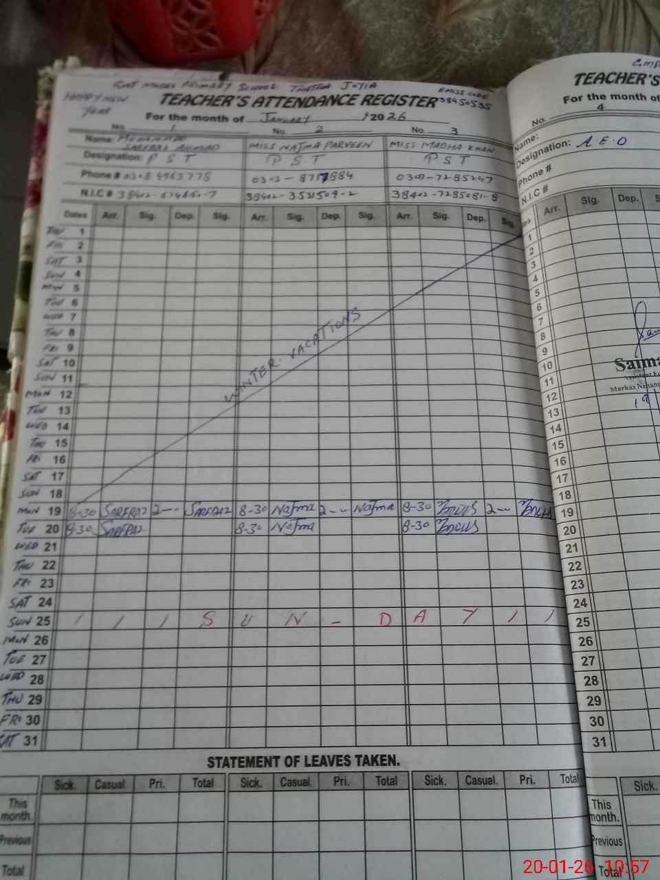 | CNIC | Full Name | Designation | R/C | Absence during last cal. month |