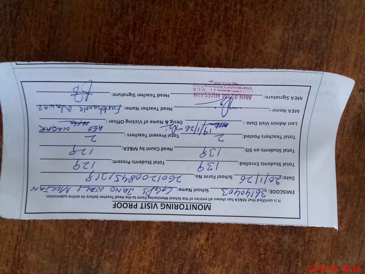 | Attendance Register | Head Teacher | MEA with School | Visit Proof |
