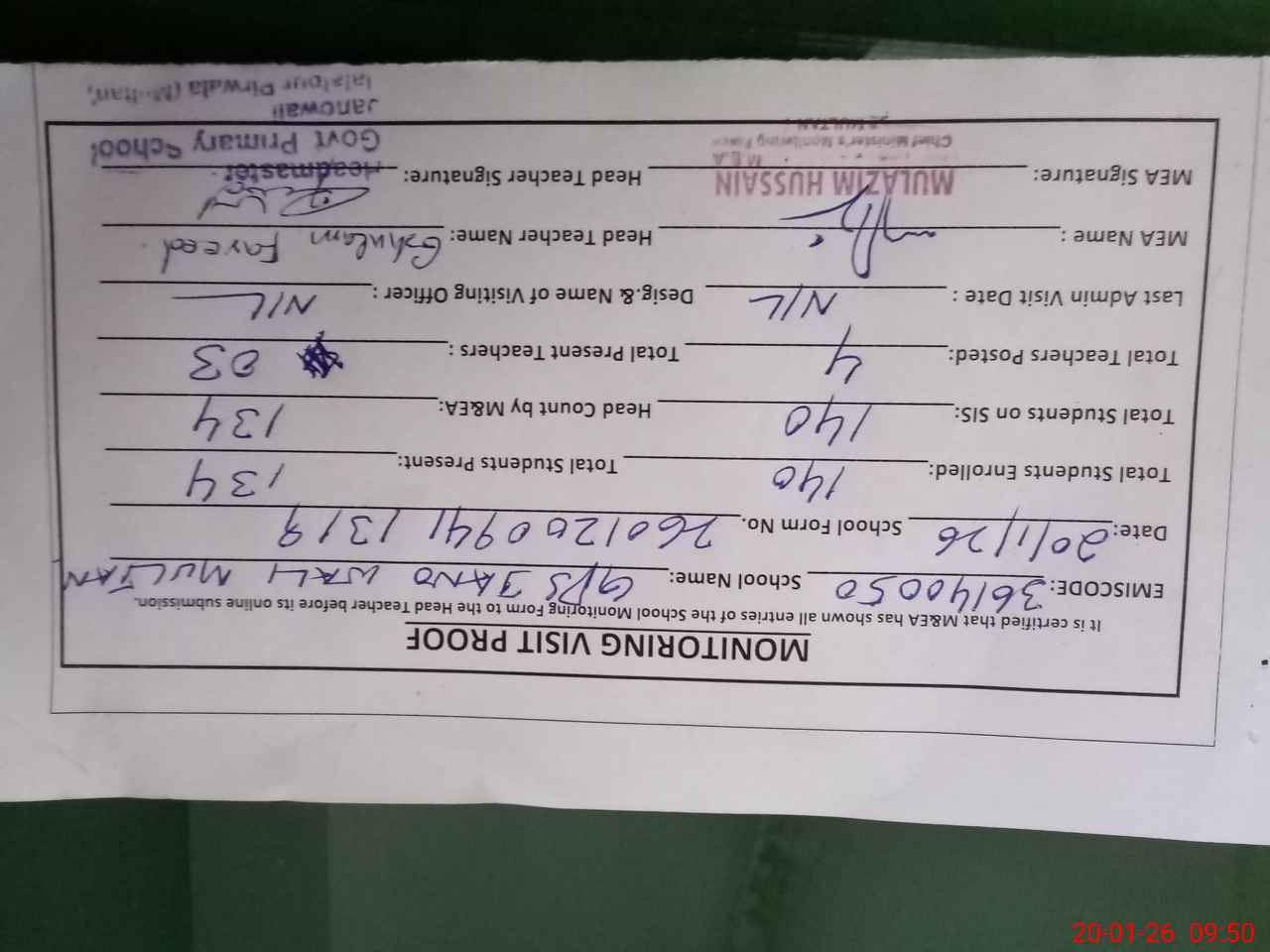 | Attendance Register | Head Teacher | MEA with School | Visit Proof |