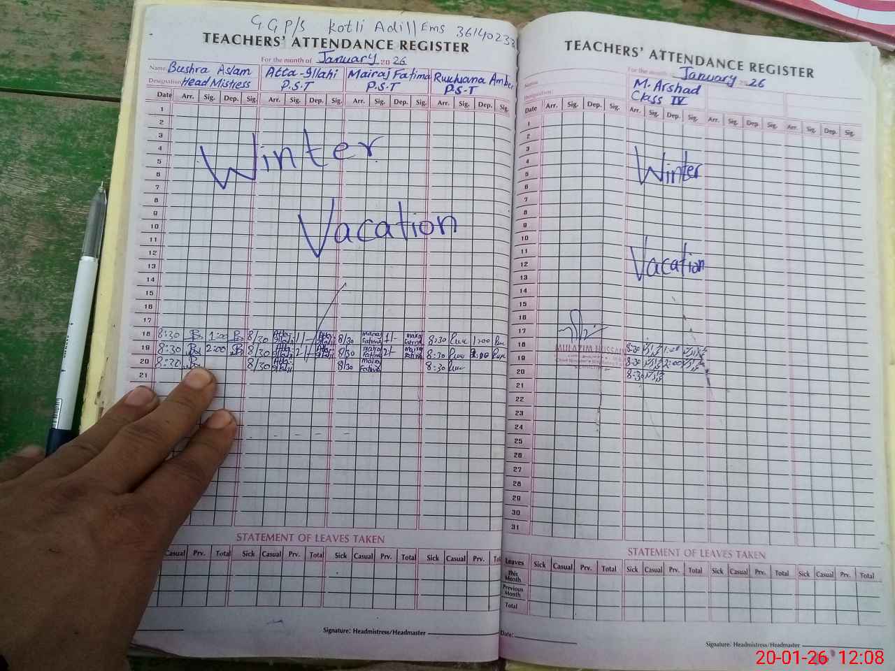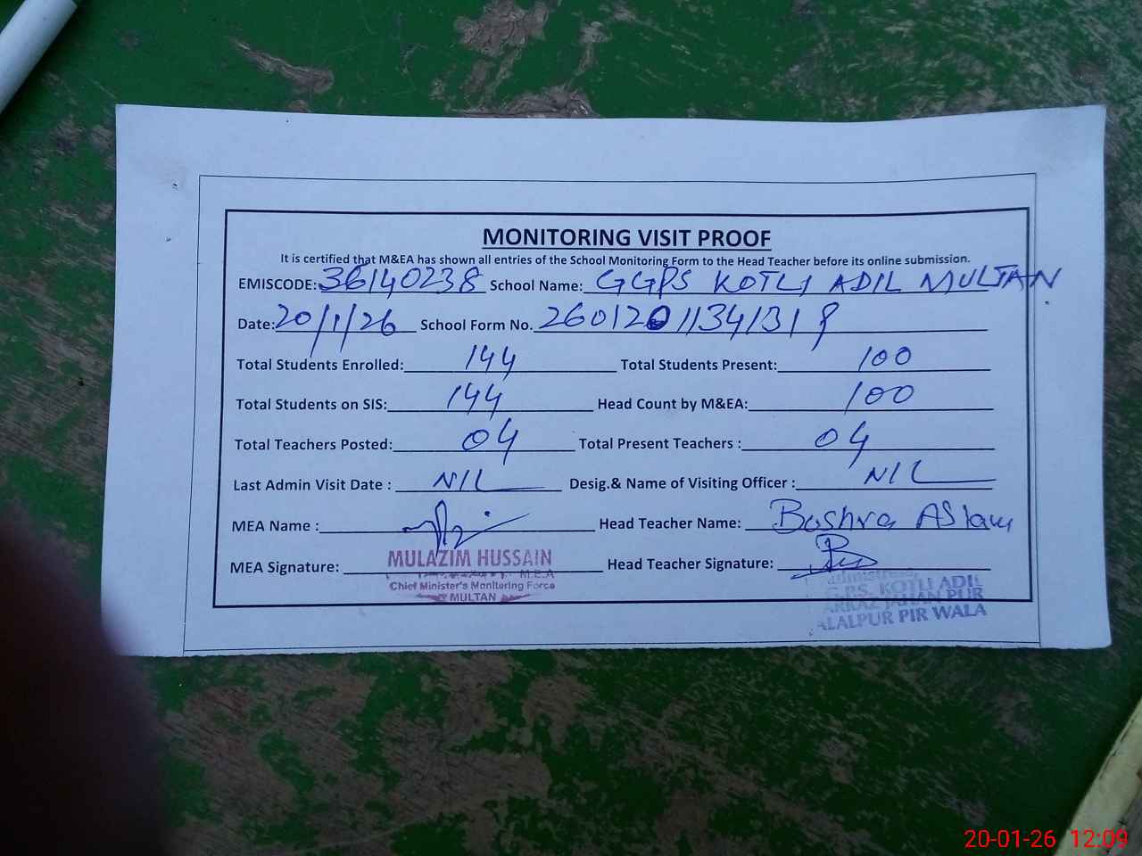 | Attendance Register | Head Teacher | MEA with School | Visit Proof |