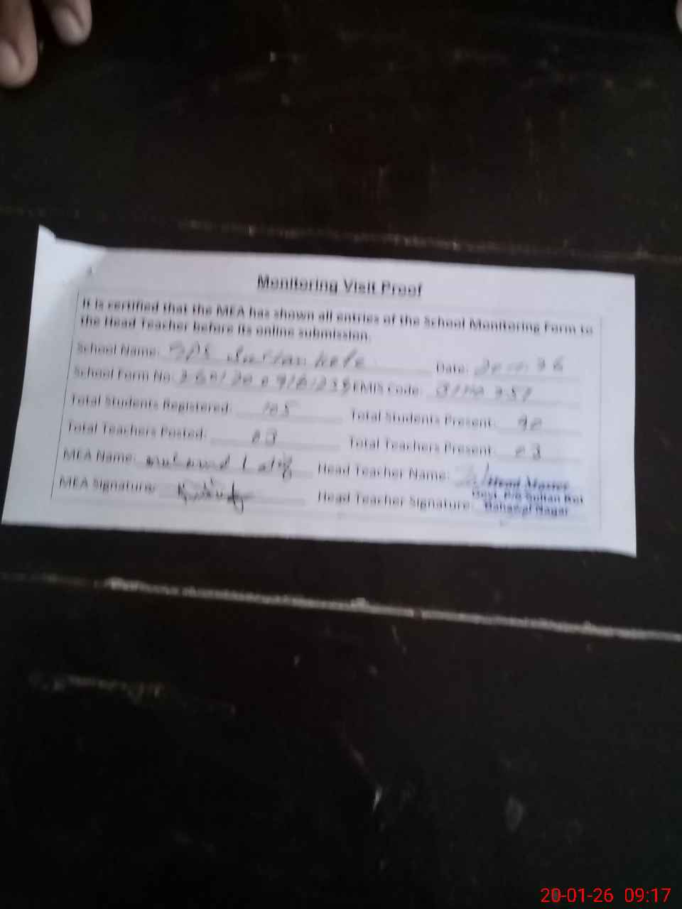 | Attendance Register | Head Teacher | MEA with School | Visit Proof |