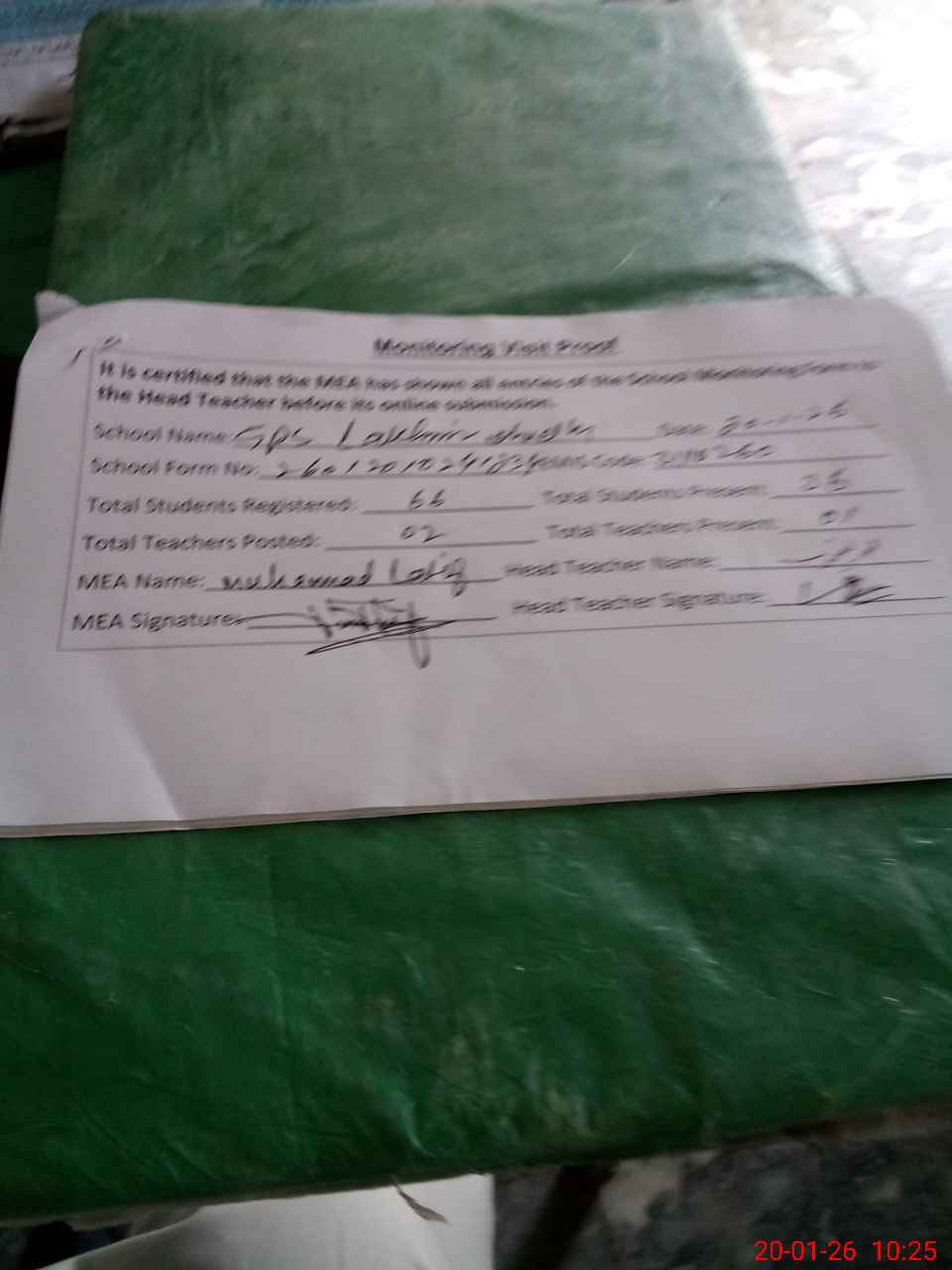 | Attendance Register | Head Teacher | MEA with School | Visit Proof |