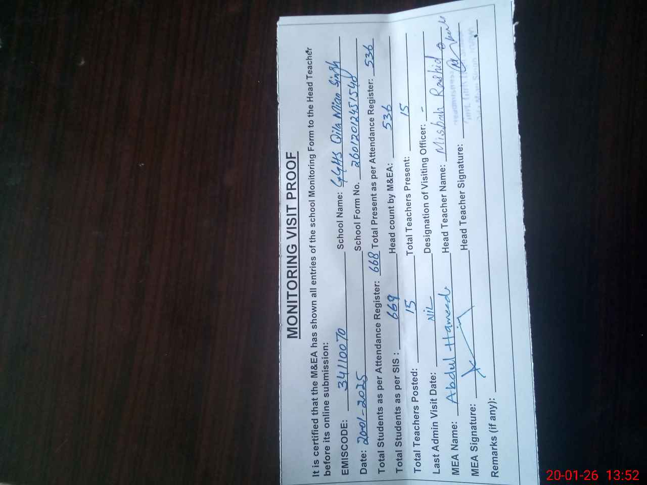 | Attendance Register | Head Teacher | MEA with School | Visit Proof |