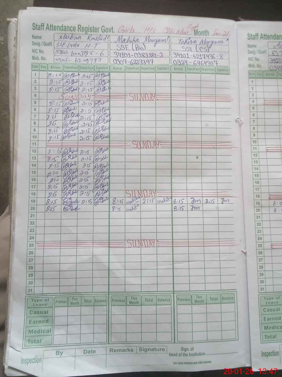 | CNIC | Full Name | Designation | R/C | Absence During Last Calender Month |