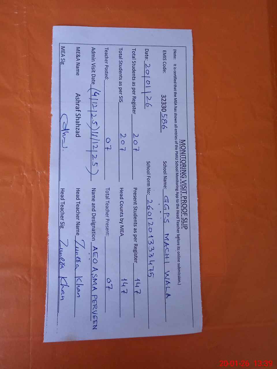 | Attendance Register | Head Teacher | MEA with School | Visit Proof |