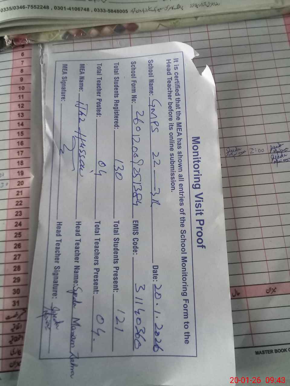 | Attendance Register | Head Teacher | MEA with School | Visit Proof |