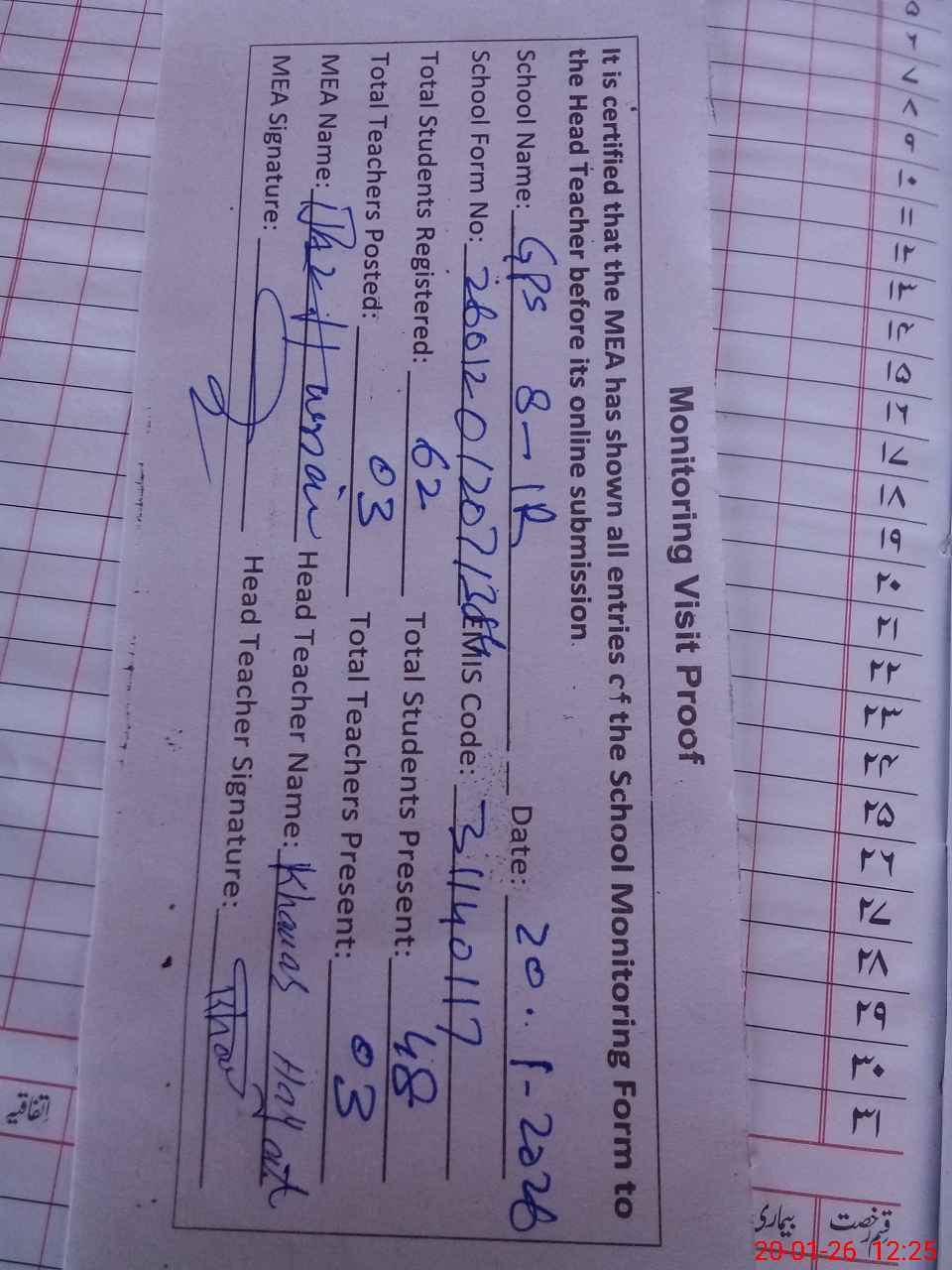 | Attendance Register | Head Teacher | MEA with School | Visit Proof |