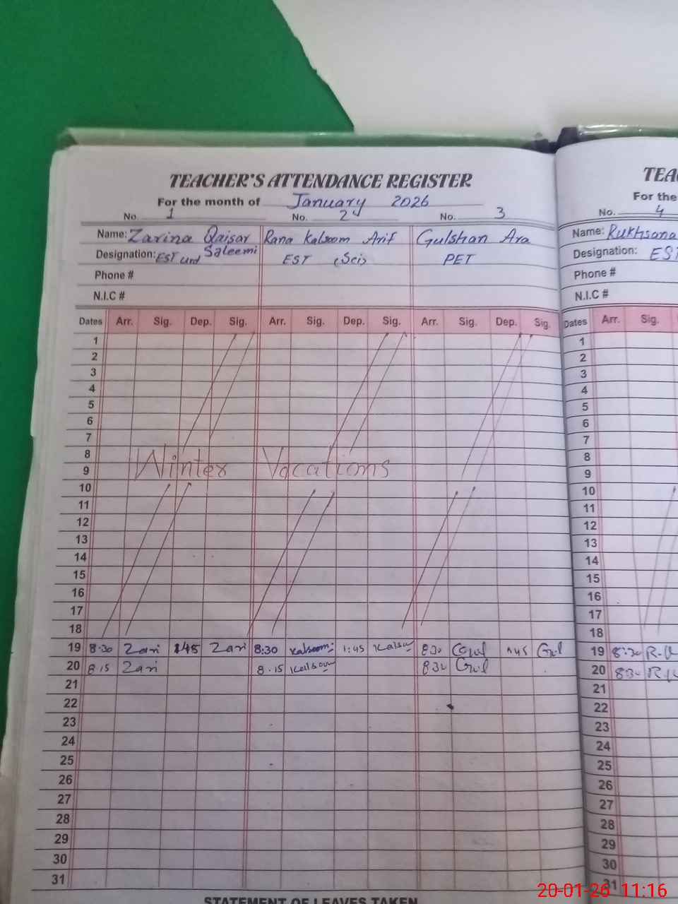 | 33**** | Sa**** No**** | ESE Arts | Contract | 0 | 0 | 0 | 0 | 0 | 0 | 0 | 0 | 0 | Absent (Un-Authorized) |