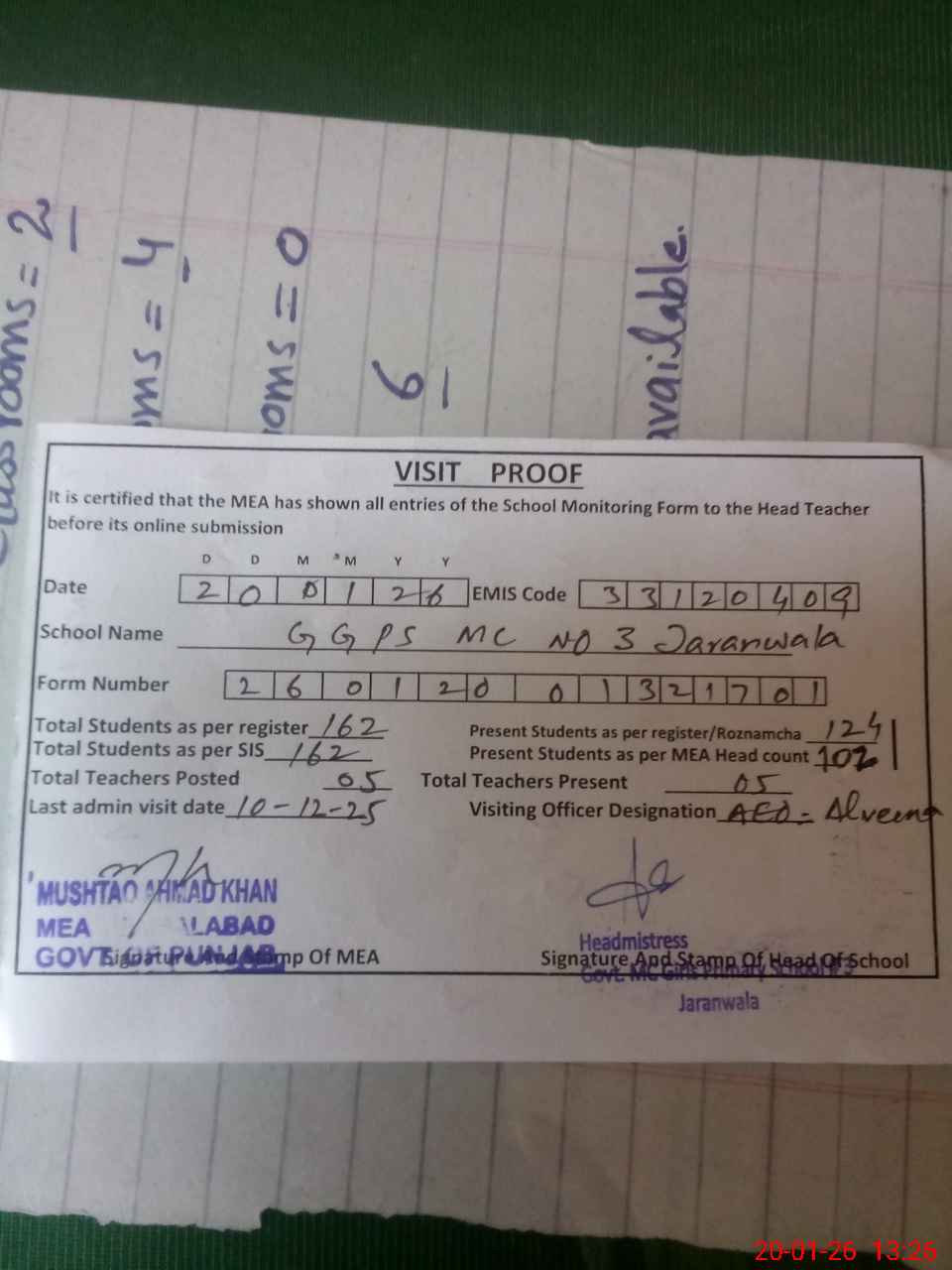 | Attendance Register | Head Teacher | MEA with School | Visit Proof |