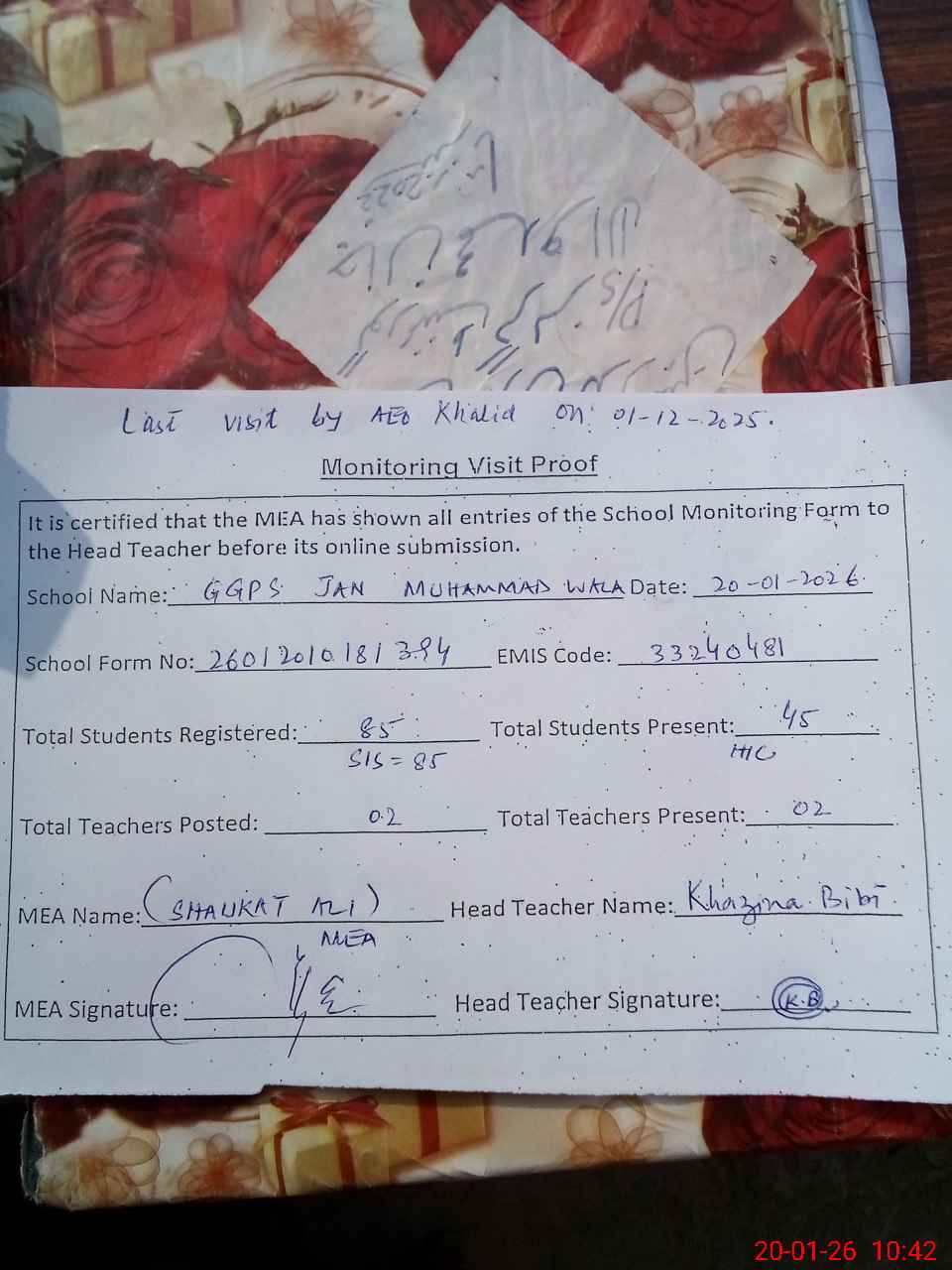 | Attendance Register | Head Teacher | MEA with School | Visit Proof |