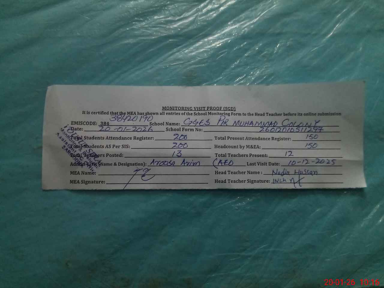 | Attendance Register | Head Teacher | MEA with School | Visit Proof |