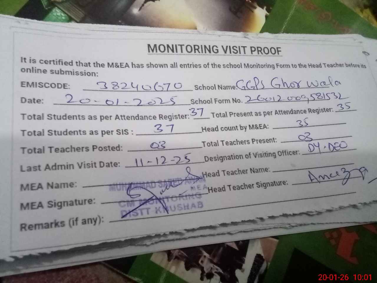 | Remarks (Use Separate Page if Required): Students on SIS Qty 37 Last admin visit On 11 December 2025 by Dy DEO | |||||