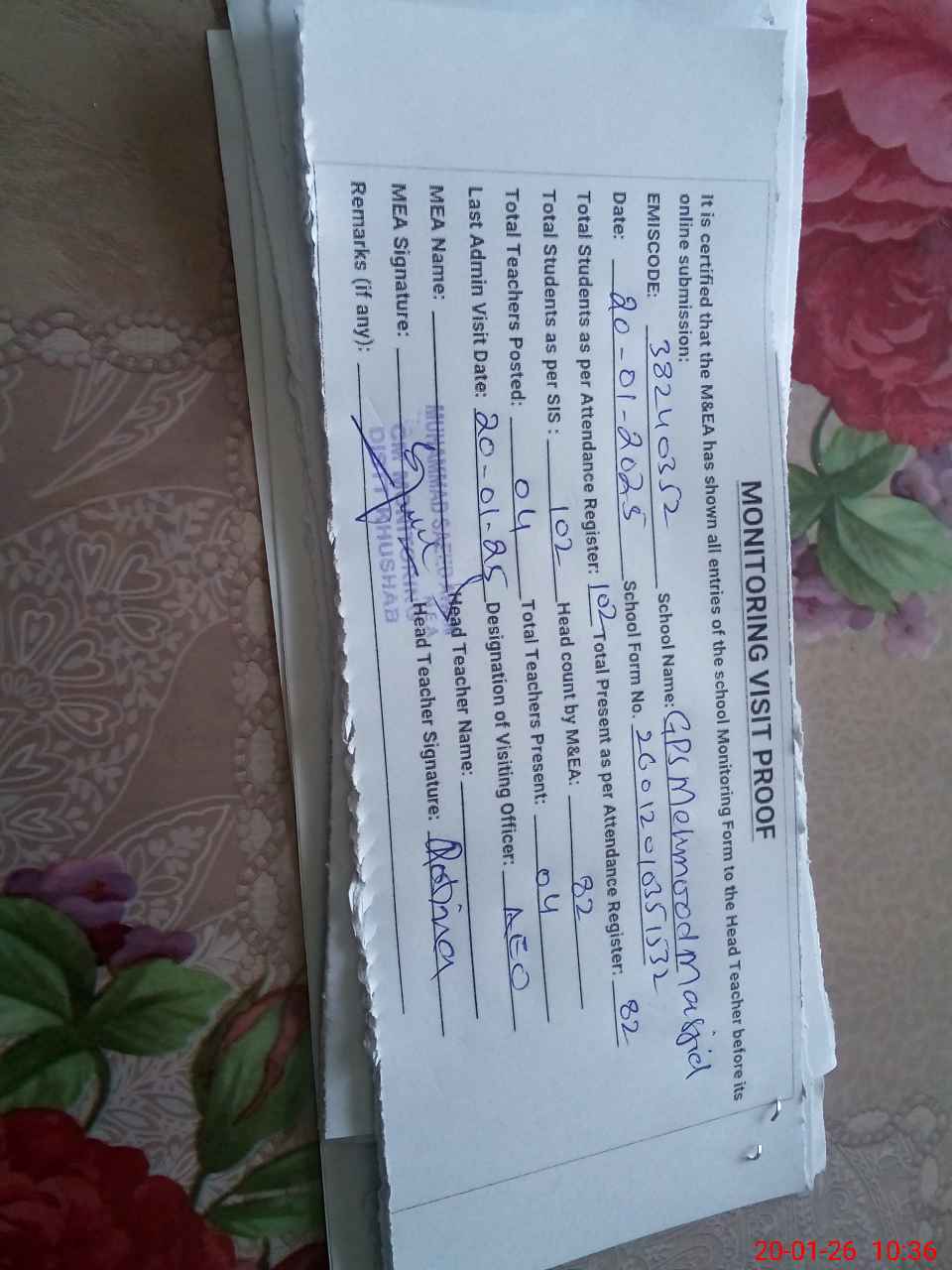| Remarks (Use Separate Page if Required): Students on SIS Qty 102 Last admin visit On 20 January 2026 by AEO | |||||