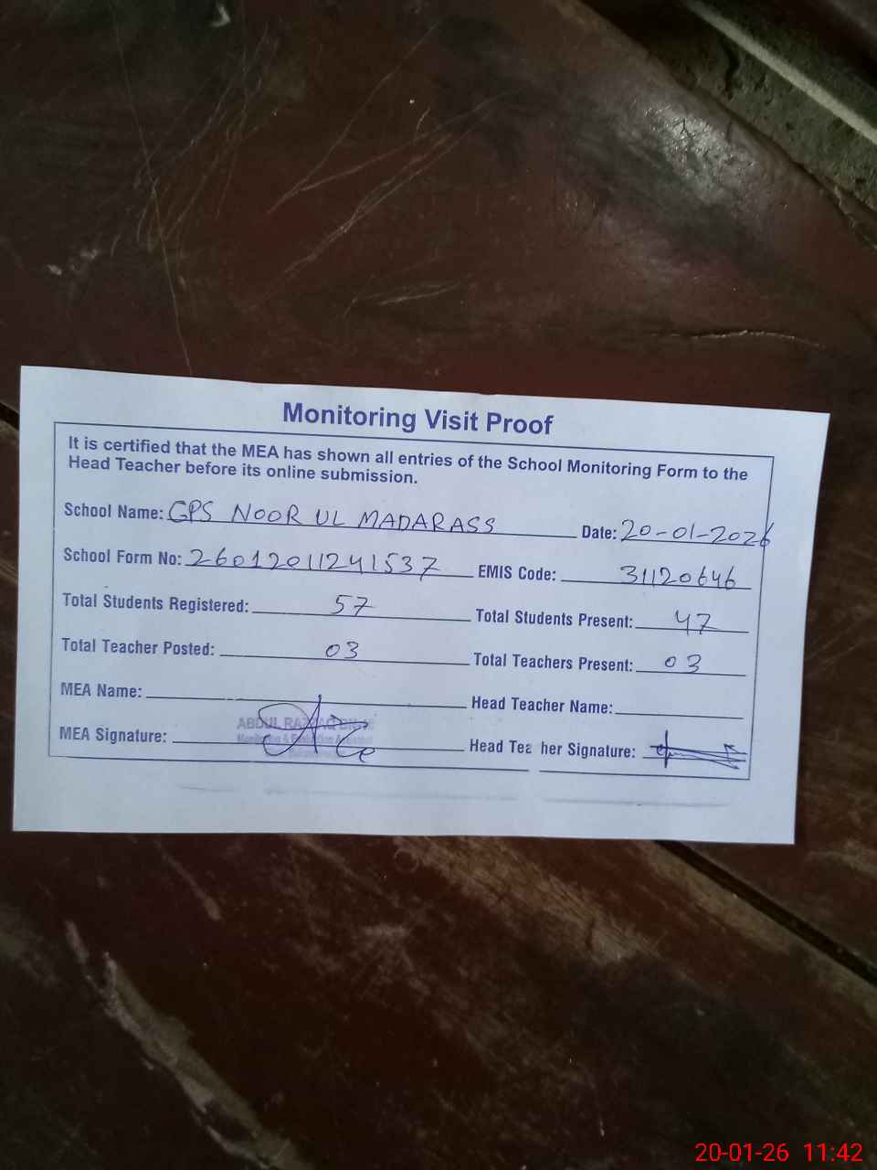 | Attendance Register | Head Teacher | MEA with School | Visit Proof |