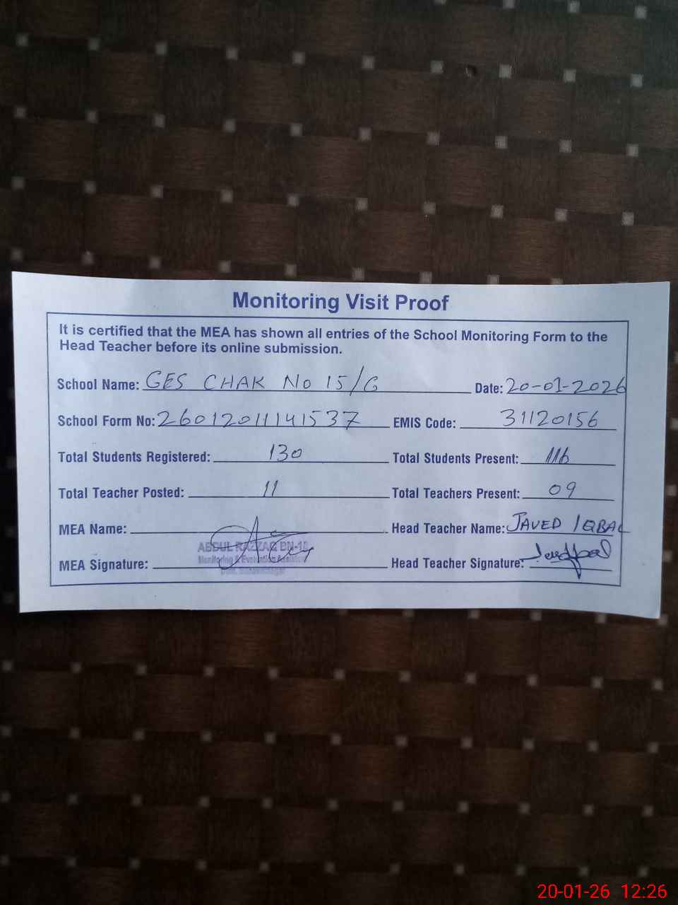 | EMIS Code: 31120156 | Name of School: GES CHAK 15 GAJIANI | |||