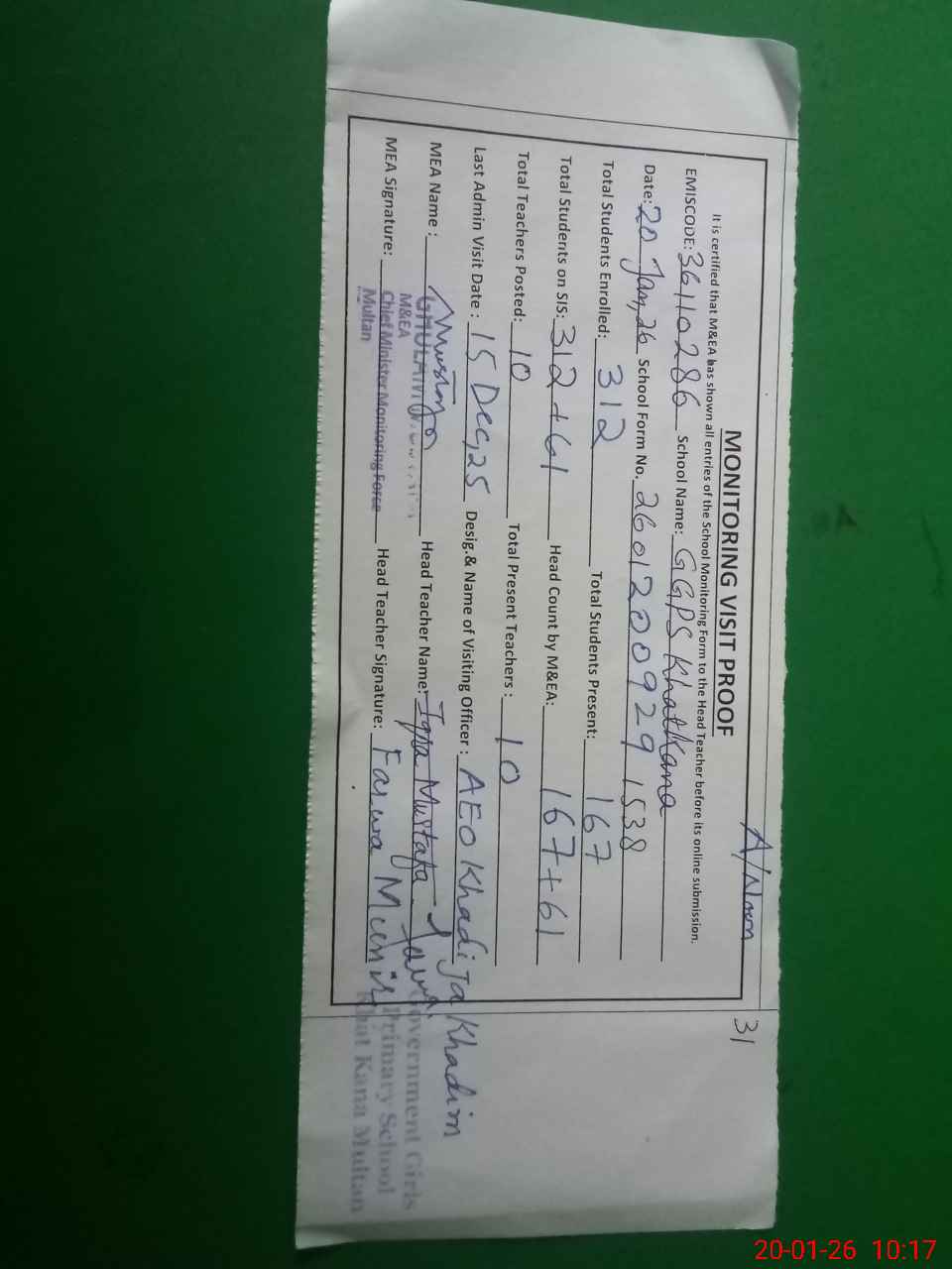 | Monitoring Date: 20-01-2026 | Start Time: 20-01-2026 09:29 AM | End Time: 20-01-2026 10:23 AM | Name of MEA: Gh**** Mu**** | |