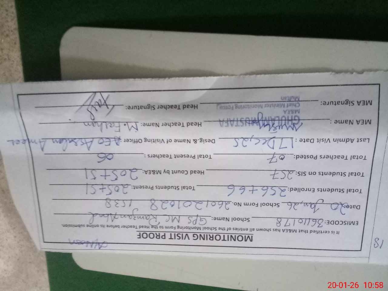 | EMIS Code: 36110178 | Name of School: GPS MC RAMZAN ABAD MULTAN | |||