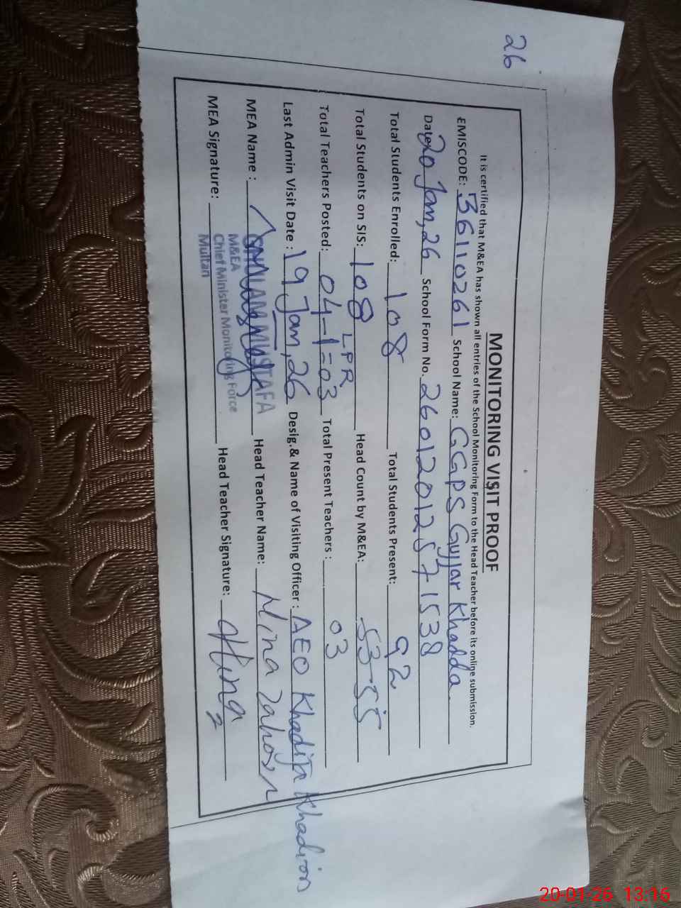 | EMIS Code: 36110261 | Name of School: GGPS GUJJAR KHADA MULTAN | |||