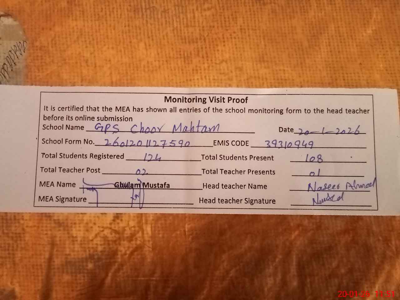 | Attendance Register | Head Teacher | MEA with School | Visit Proof |