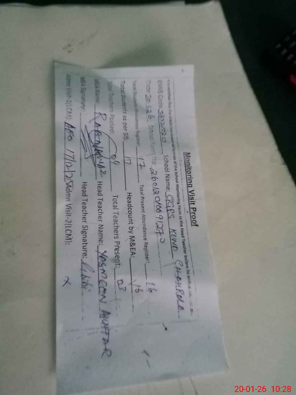 | Attendance Register | Head Teacher | MEA with School | Visit Proof |