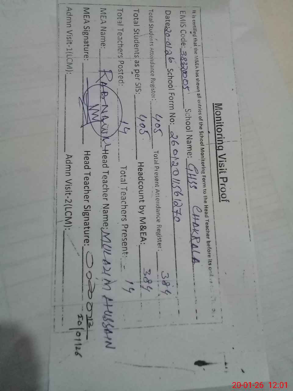 | Attendance Register | Head Teacher | MEA with School | Visit Proof |
