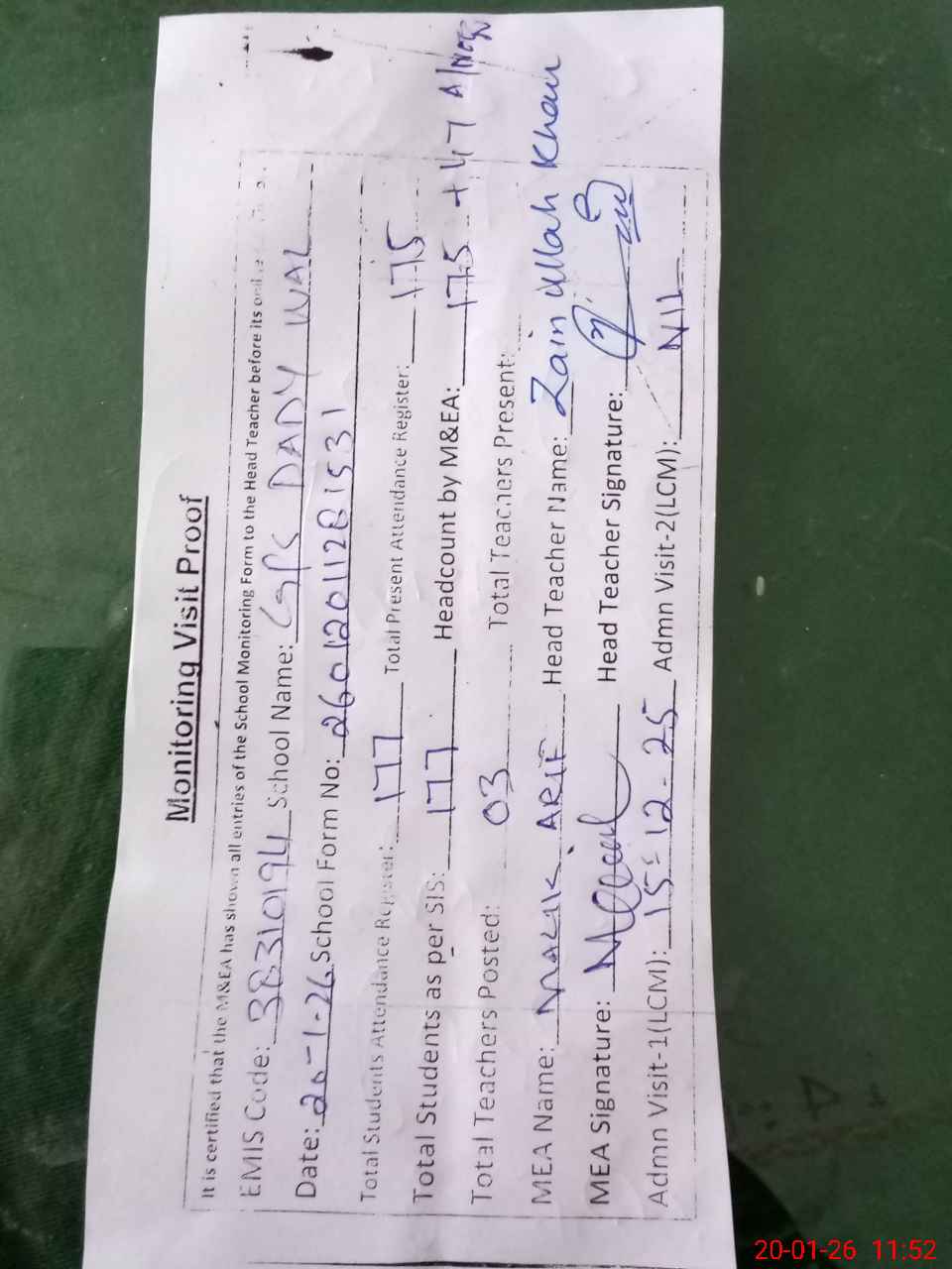 | Attendance Register | Head Teacher | MEA with School | Visit Proof |