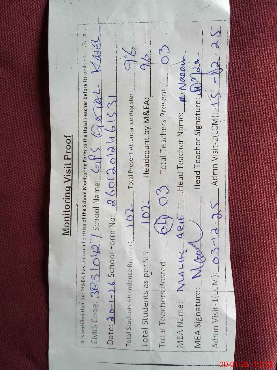 | Attendance Register | Head Teacher | MEA with School | Visit Proof |