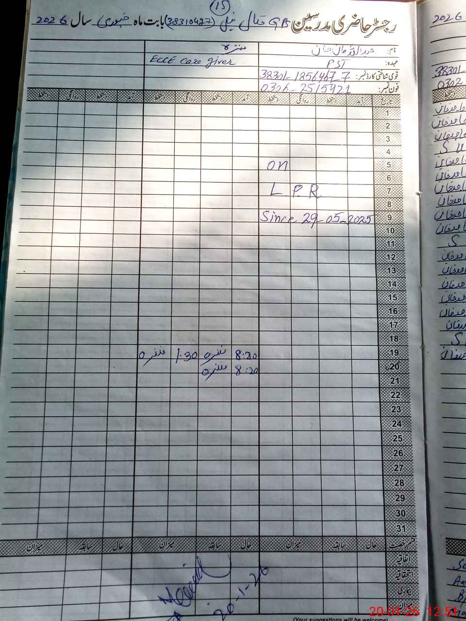 | CNIC | Full Name | Designation | R/C | Absence During Last Calender Month |