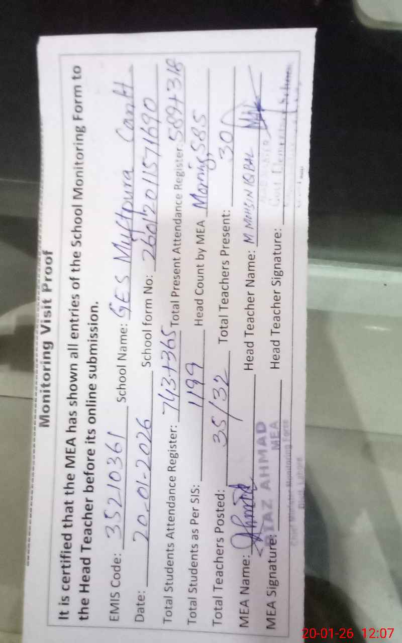 | Attendance Register | Head Teacher | MEA with School | Visit Proof |