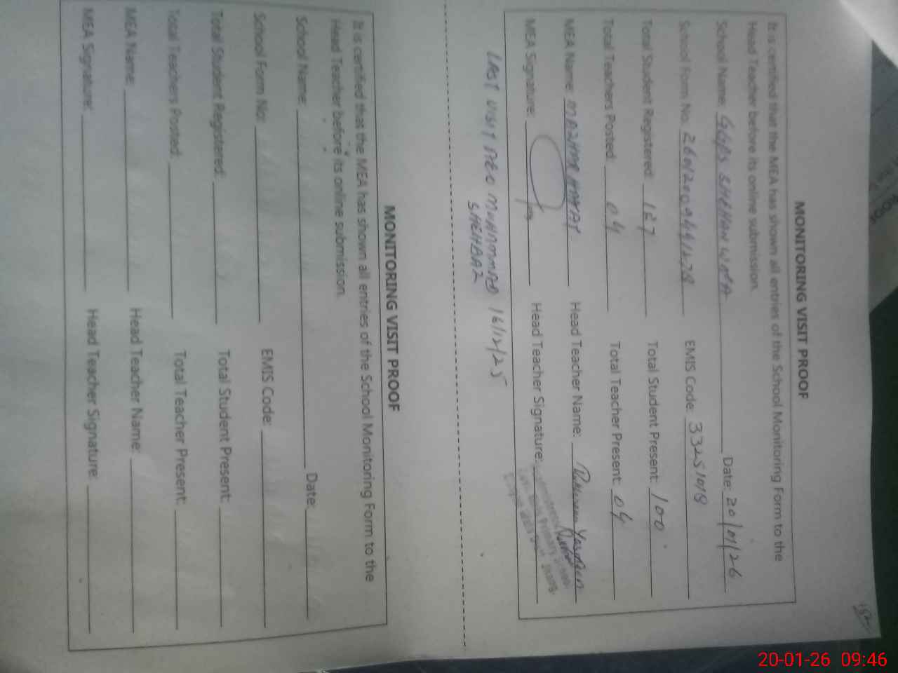 | Attendance Register | Head Teacher | MEA with School | Visit Proof |