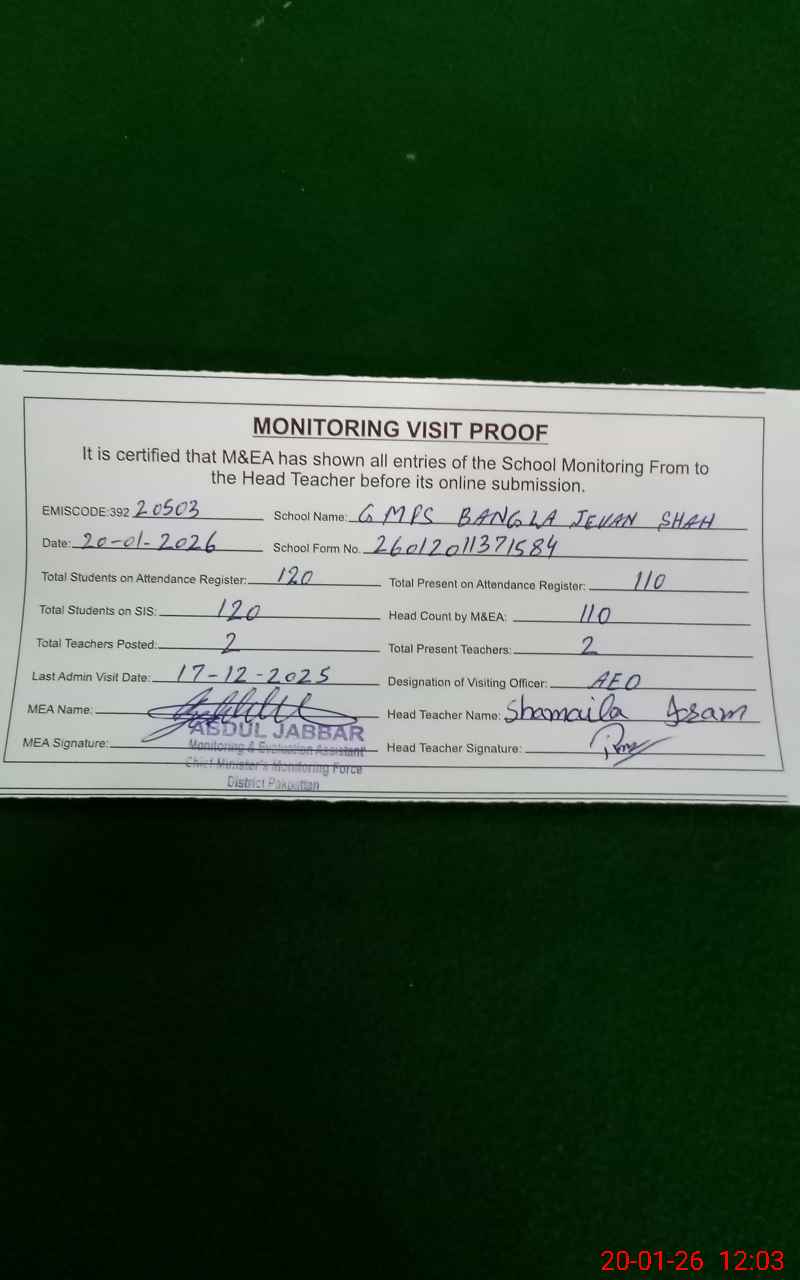 | EMIS Code: 39220503 | Name of School: GMPS BANGLA JEVAN SHAH | |||
