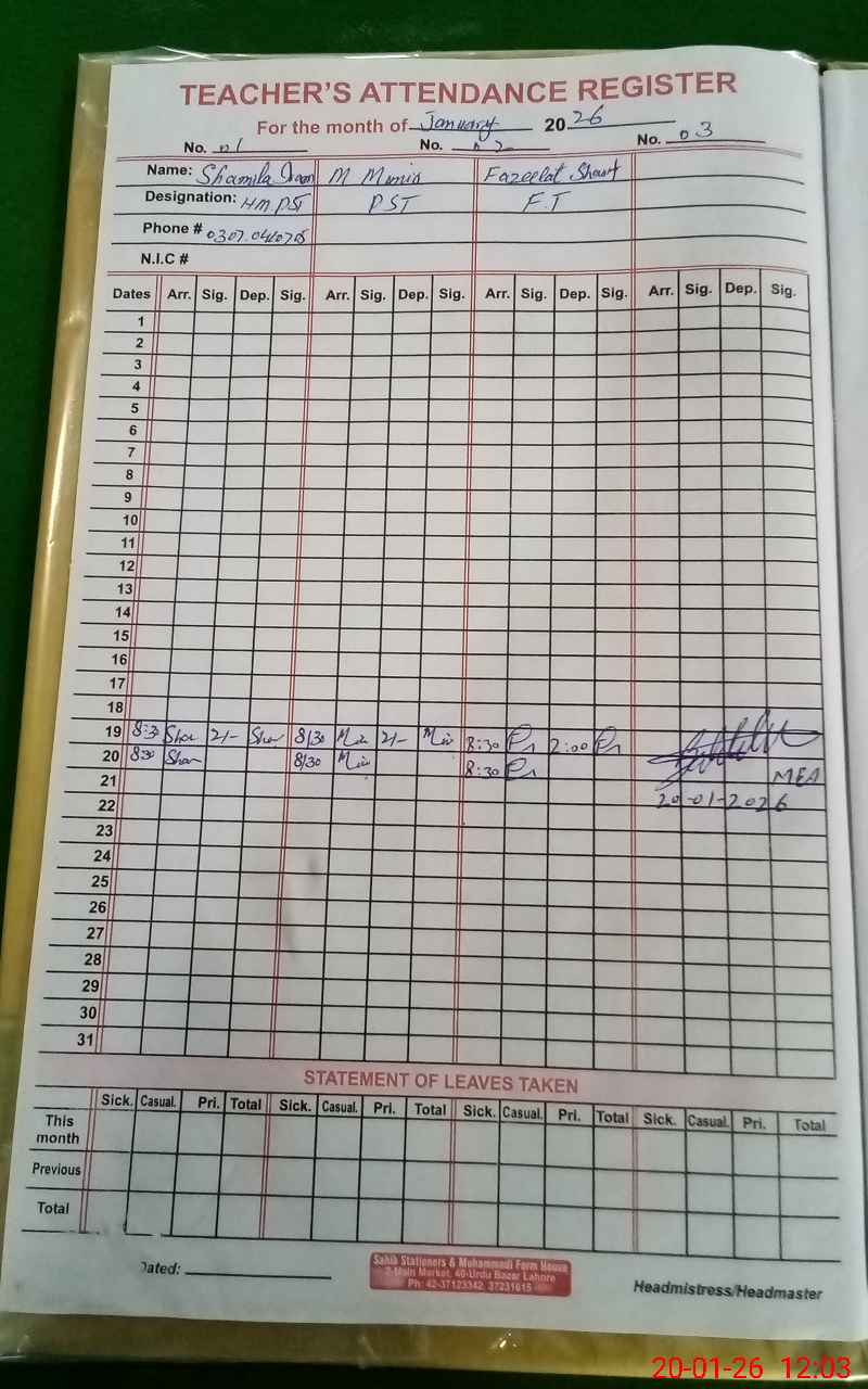 | Name: SH**** IR**** Designation: (School Headmaster's/Headmistress's) PST Phone/Cell Number: 03**** |