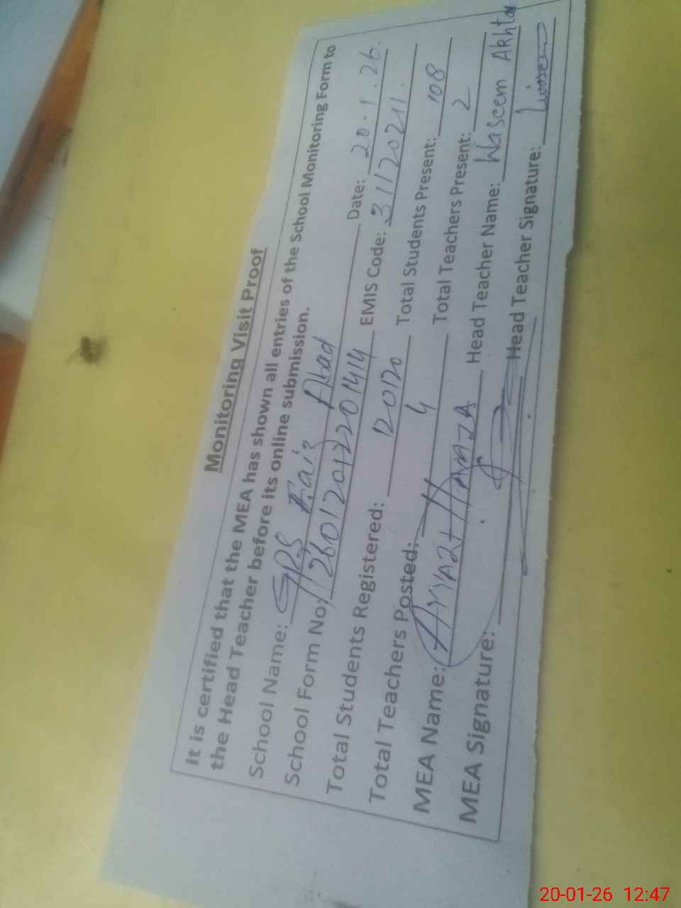 | Attendance Register | Head Teacher | MEA with School | Visit Proof |