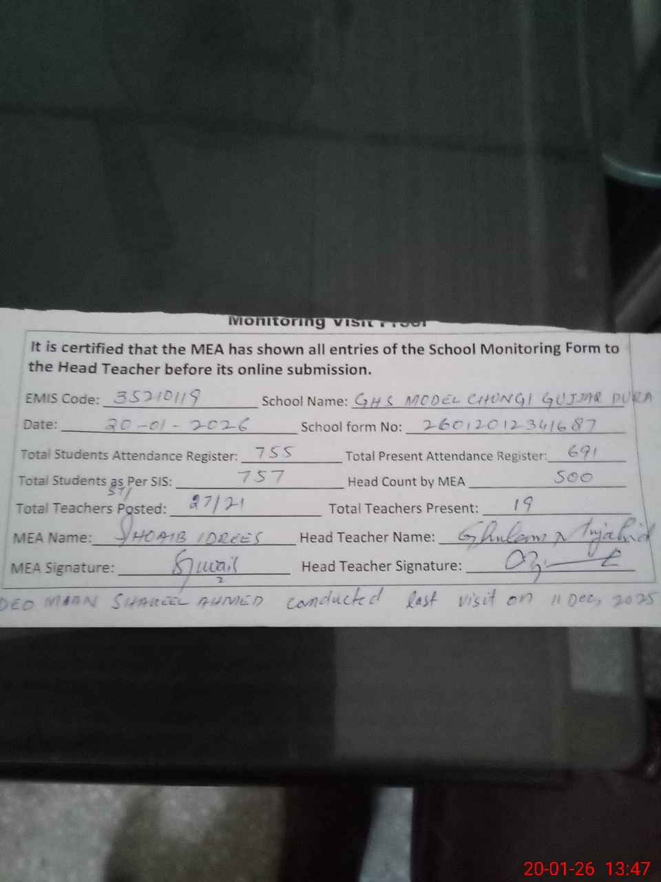 | Attendance Register | Head Teacher | MEA with School | Visit Proof |
