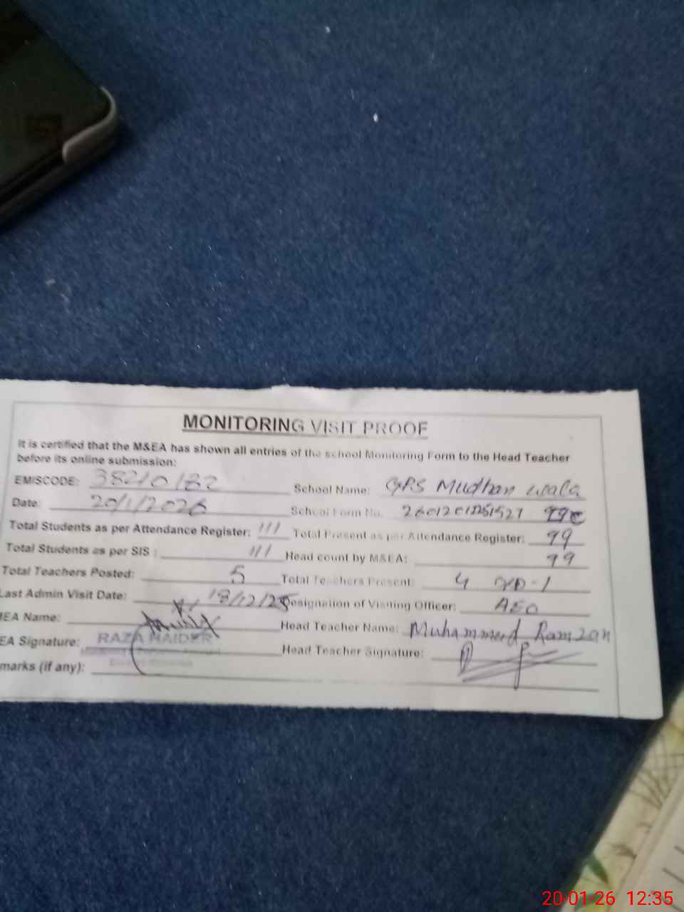 | Attendance Register | Head Teacher | MEA with School | Visit Proof |