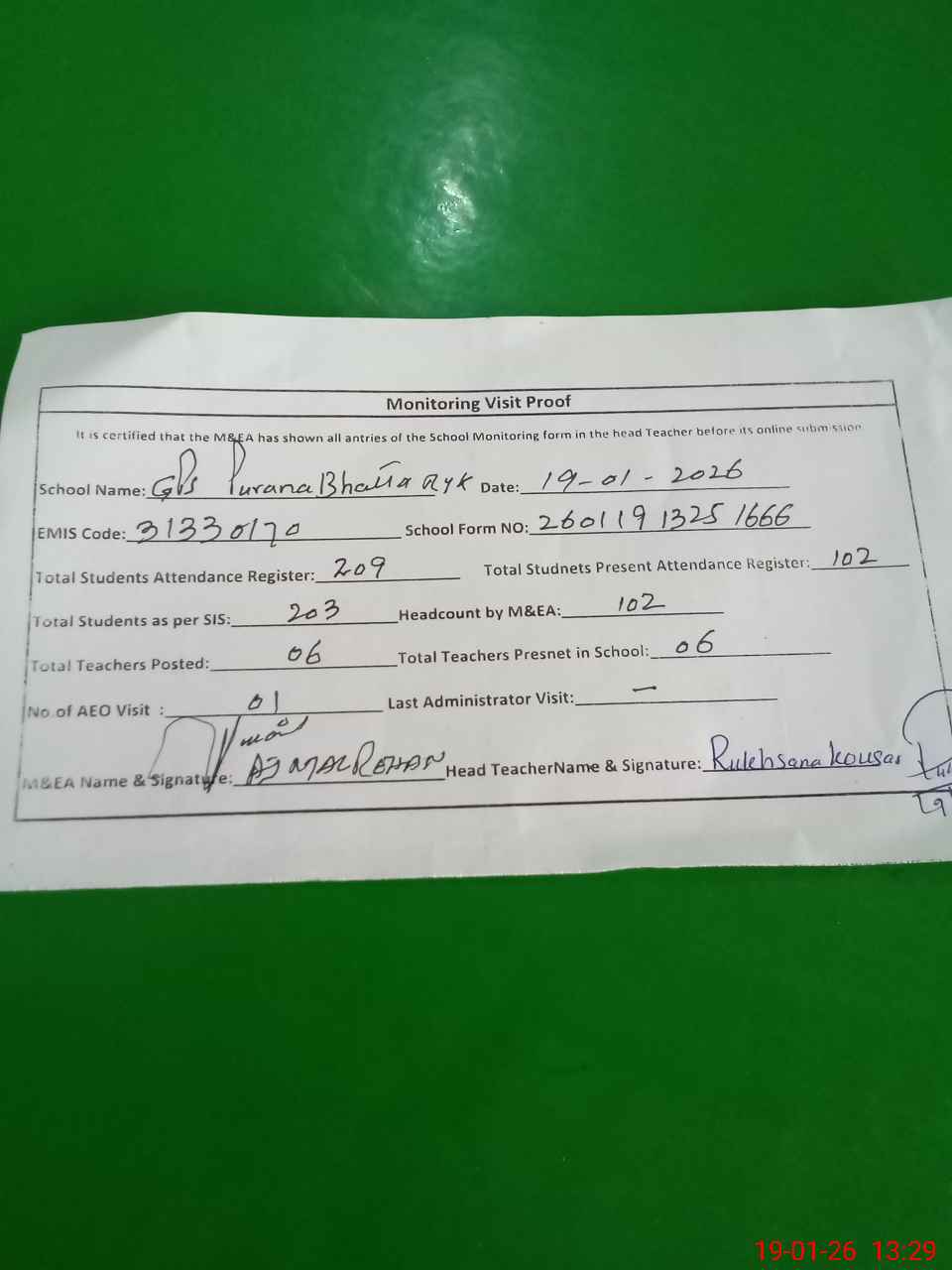 | EMIS Code: 31330170 | Name of School: GPS PURANA BHATTA RYK | |||