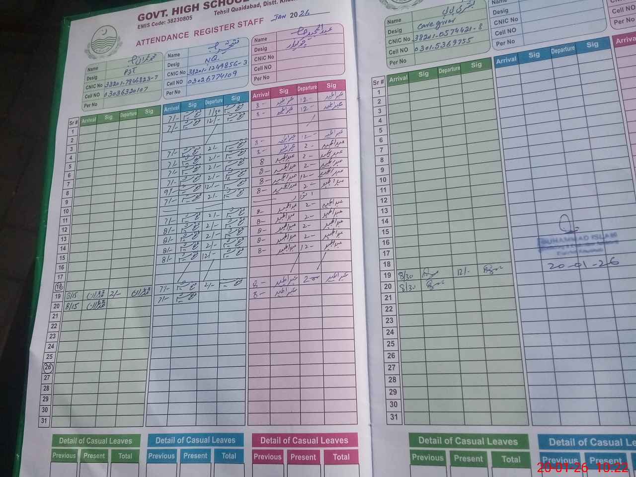 | CNIC | Full Name | Designation | R/C | Absence during last cal. month |