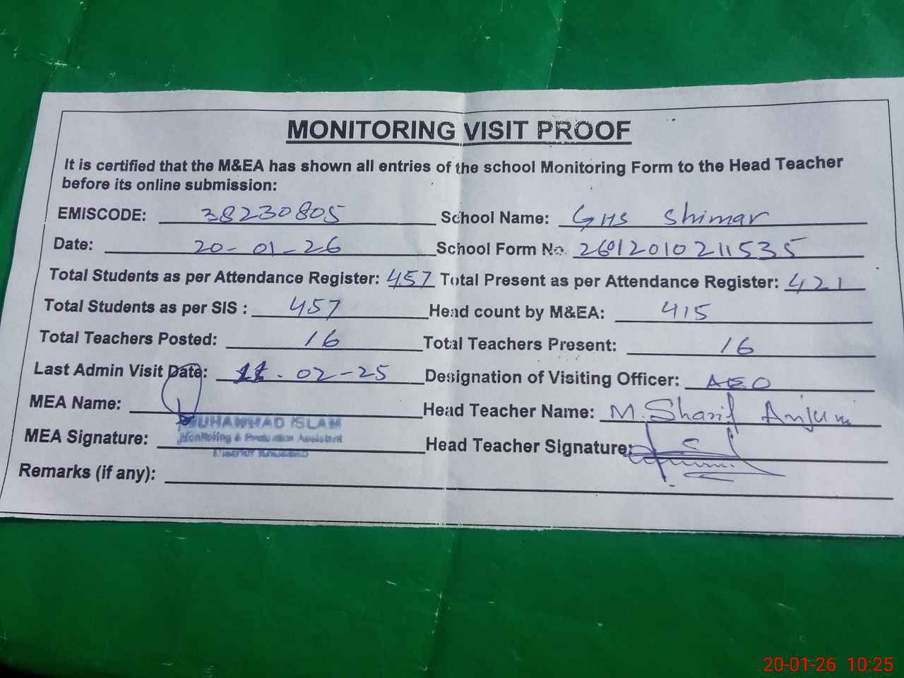 | Remarks (Use Separate Page if Required): AEO visited school on 11 February 2025 Students strength on sis 457 | |||||