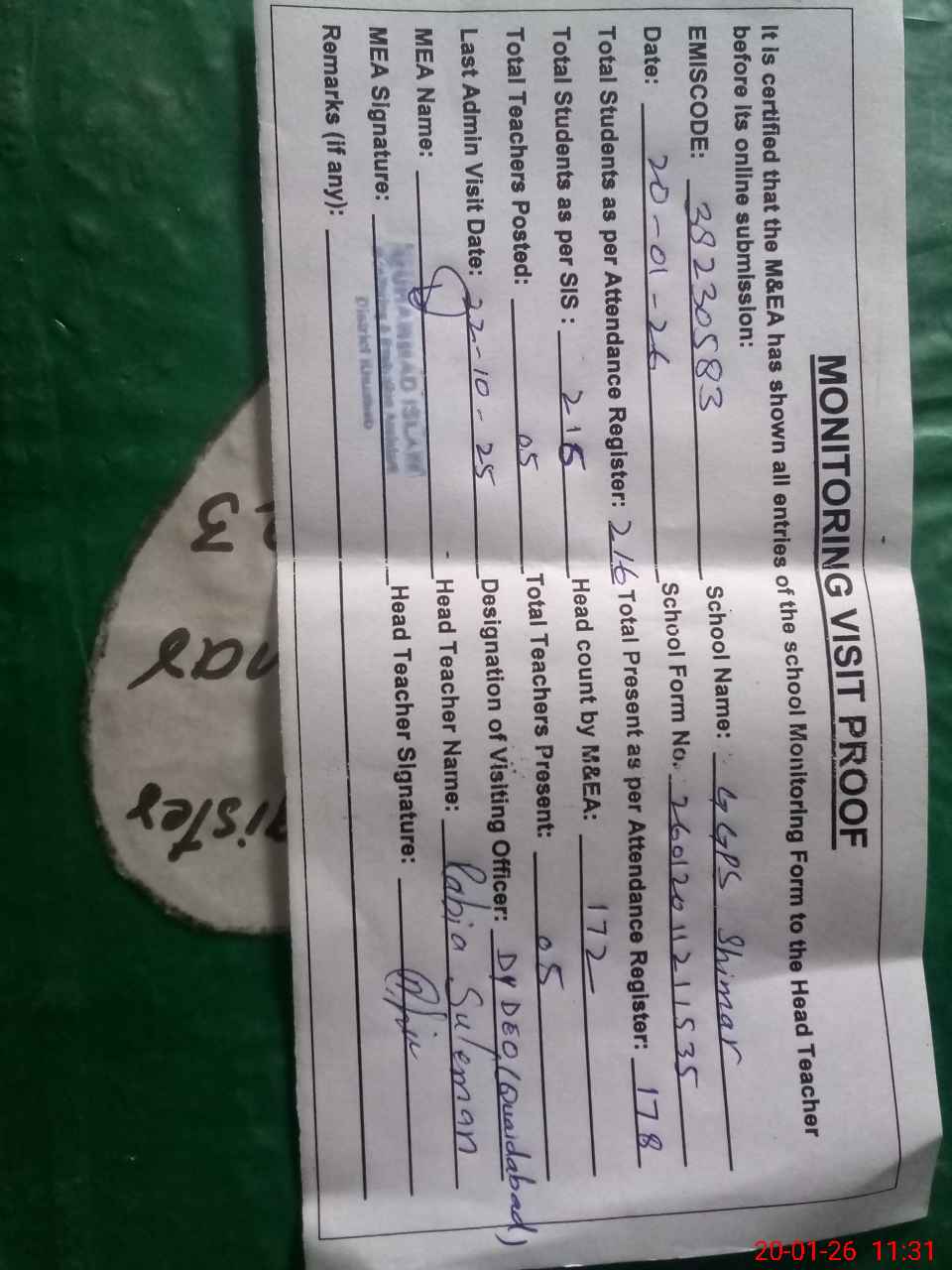 | Remarks (Use Separate Page if Required): Dy DEO visited school on 22 October 2025 students strength on sis 264 | |||||