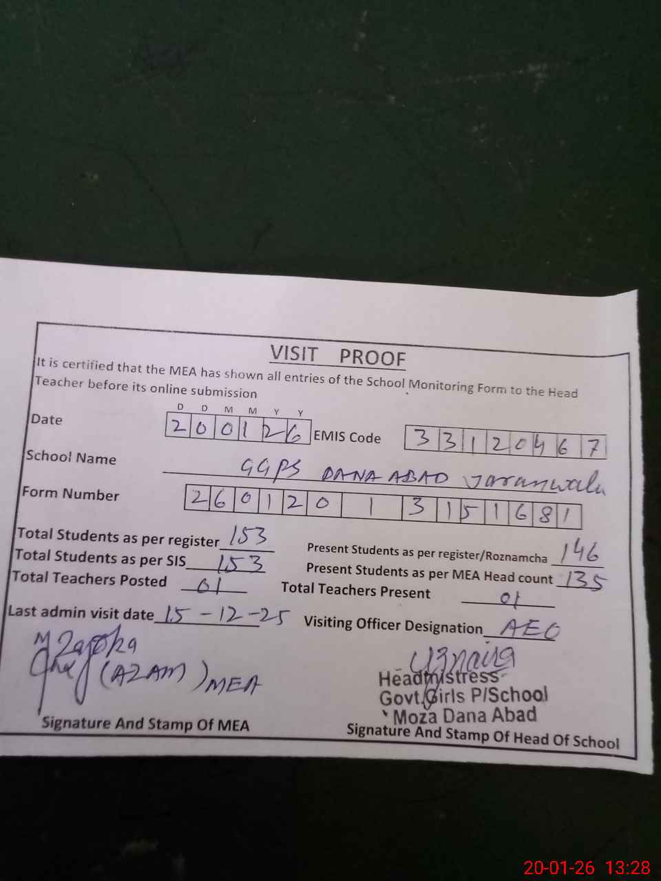 | Attendance Register | Head Teacher | MEA with School | Visit Proof |