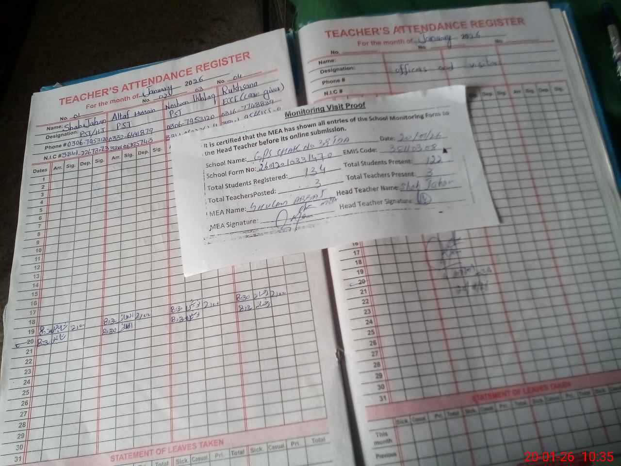 | Attendance Register | Head Teacher | MEA with School | Visit Proof |