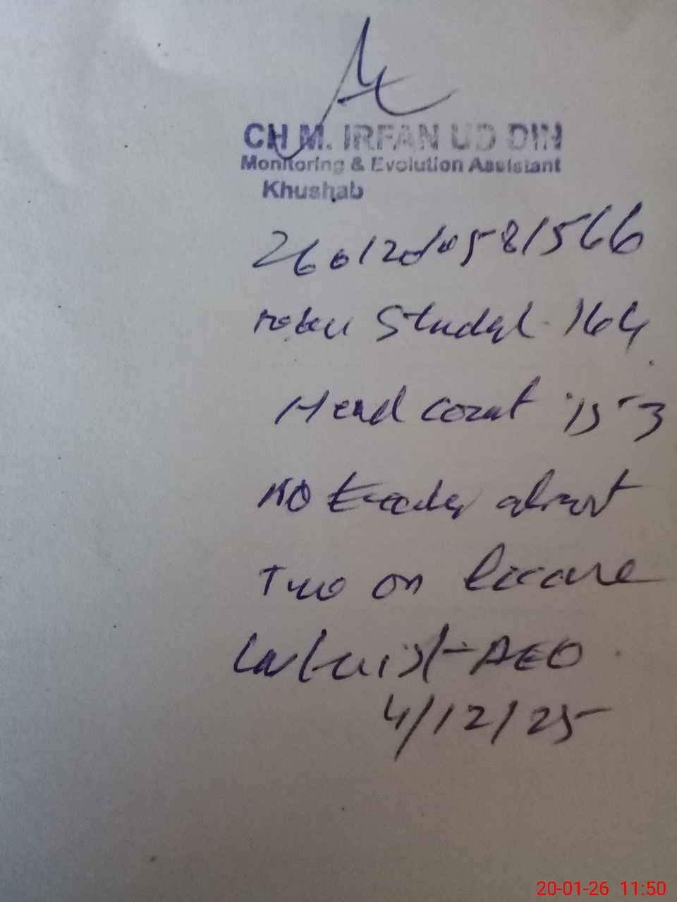 | Remarks (Use Separate Page if Required): student on sis 164 student on register 164 head count 153 no teacher absent 2 on leave last visit aeo 4/12/25 teaching and Ono teaching staff required | |||||