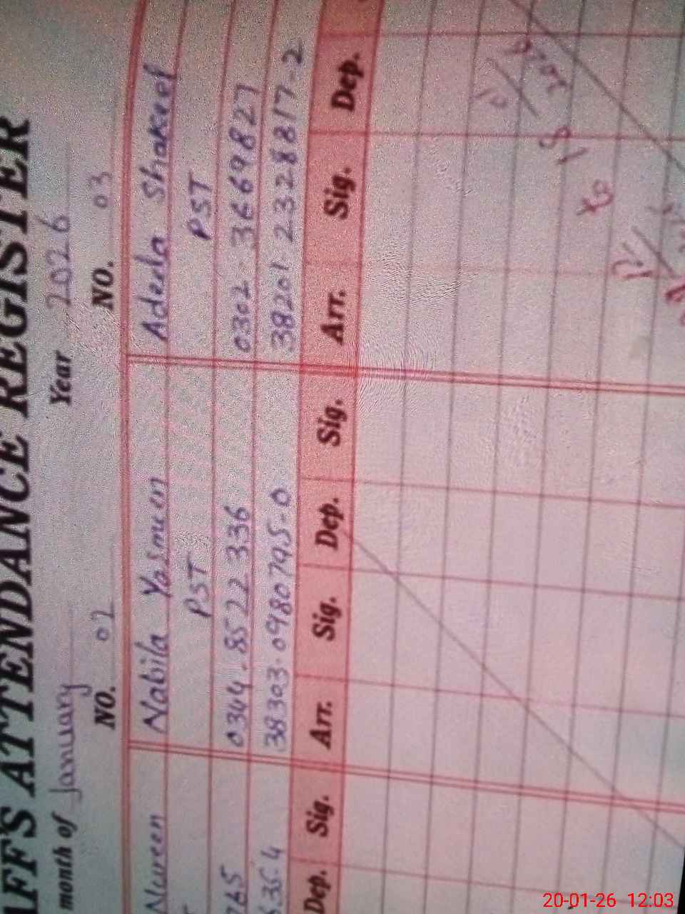 | CNIC | Full Name | Designation | R/C | Absence during last cal. month |