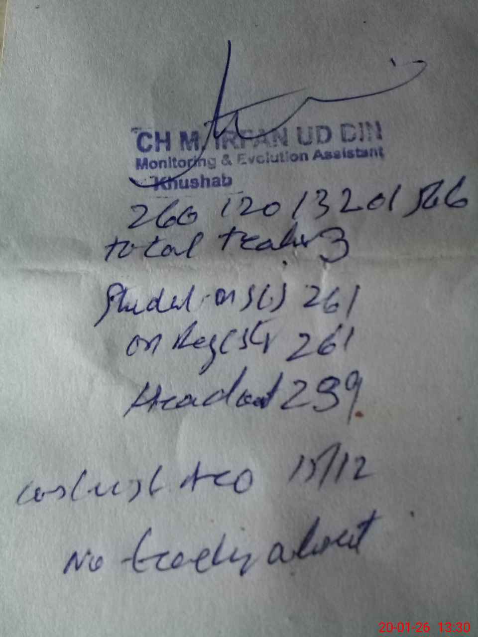 | Remarks (Use Separate Page if Required): gps 33 db student on sis 261 student on register 261 head count 239 no teacher absent last visit 15/12/25 class room required | |||||