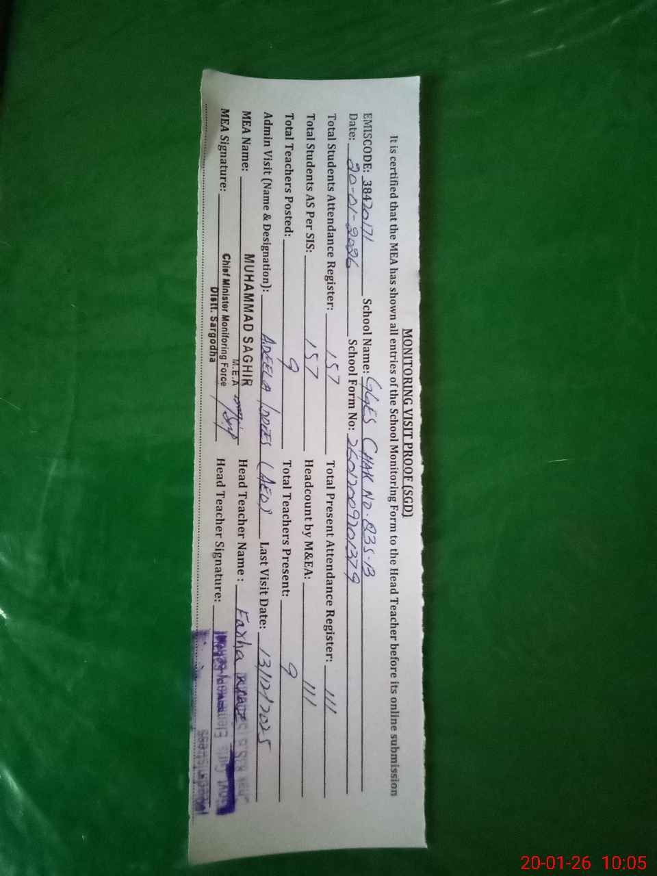 | Attendance Register | Head Teacher | MEA with School | Visit Proof |