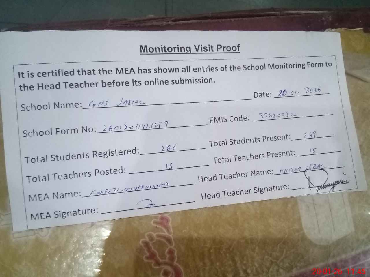 | Attendance Register | Head Teacher | MEA with School | Visit Proof |