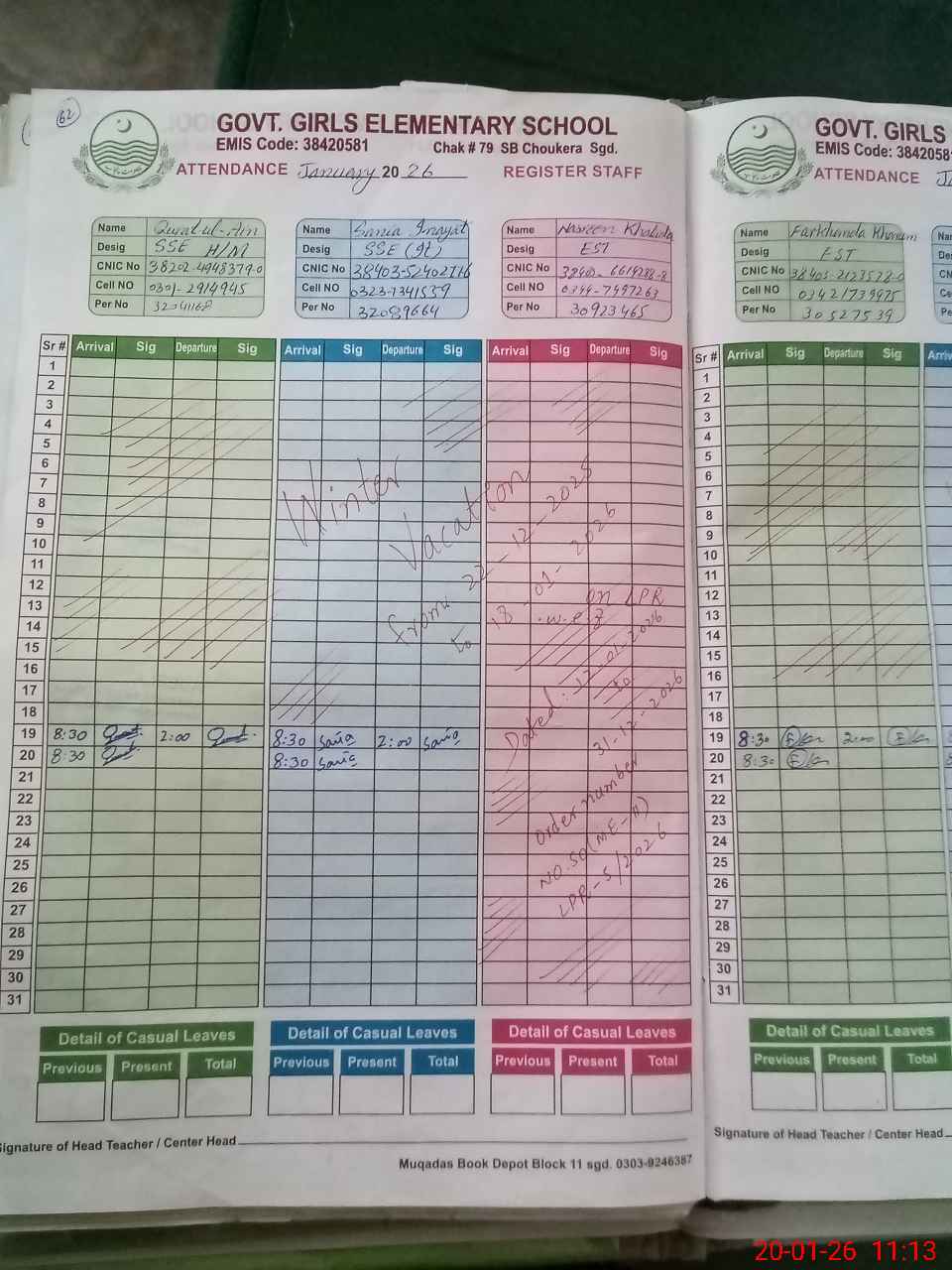 | CNIC | Full Name | Designation | R/C | Absence During Last Calender Month |